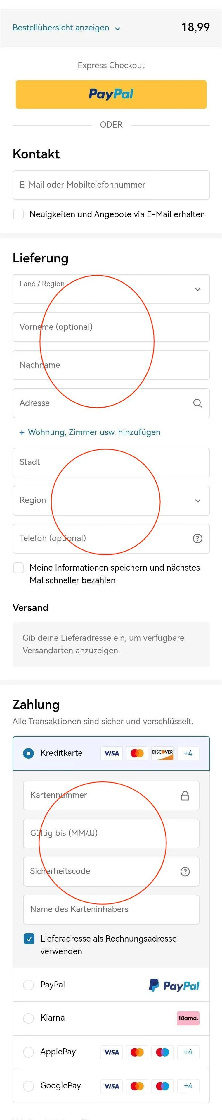 4、Geben Sie Ihre Zahlungsdaten, Rechnungsadresse und Kontaktinformationen ein.